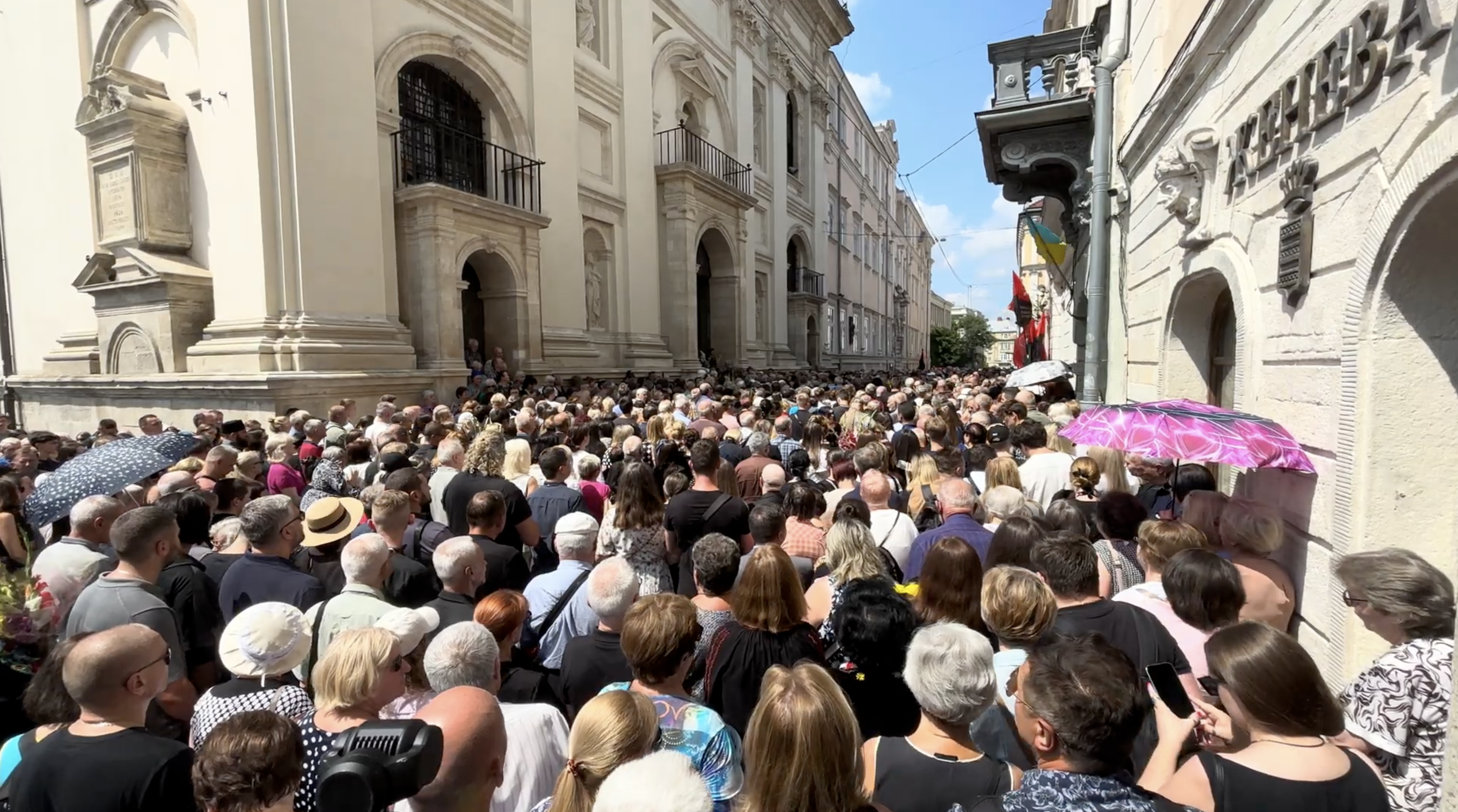 Tausende Trauernde versammelten sich vor der Jesuitenkirche Peter und Paul (wenige Meter vom Hauptquartier von S. Egidio entfernt), dort hingen viele rot-schwarze Fahnen der UPA (Stepan Banderas ukrainische Aufstandsarmee).